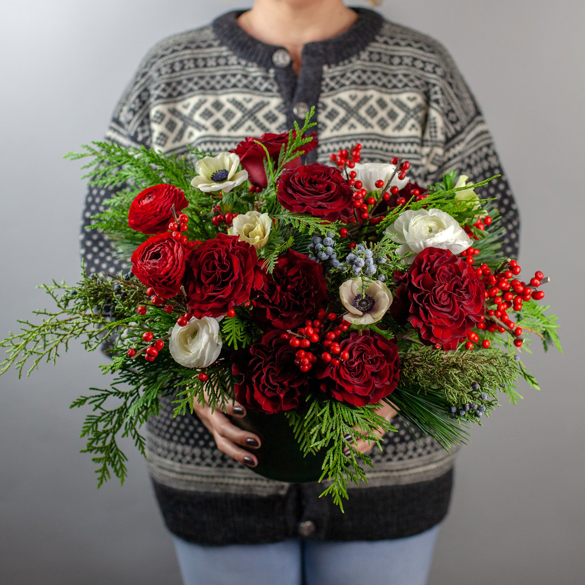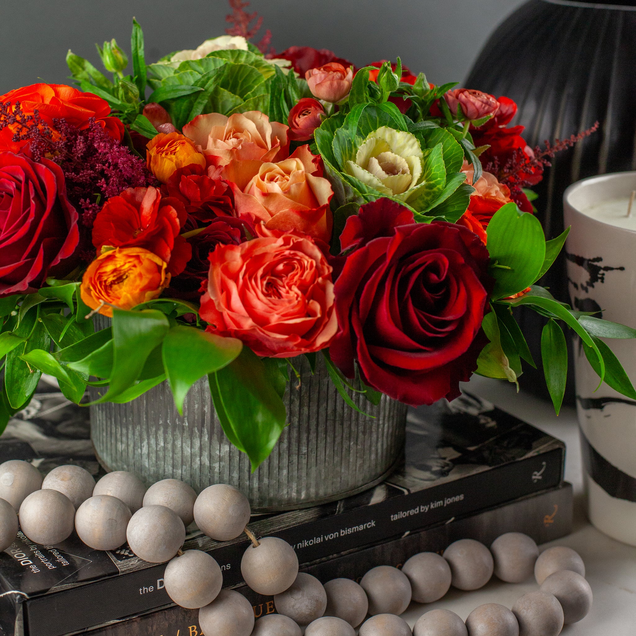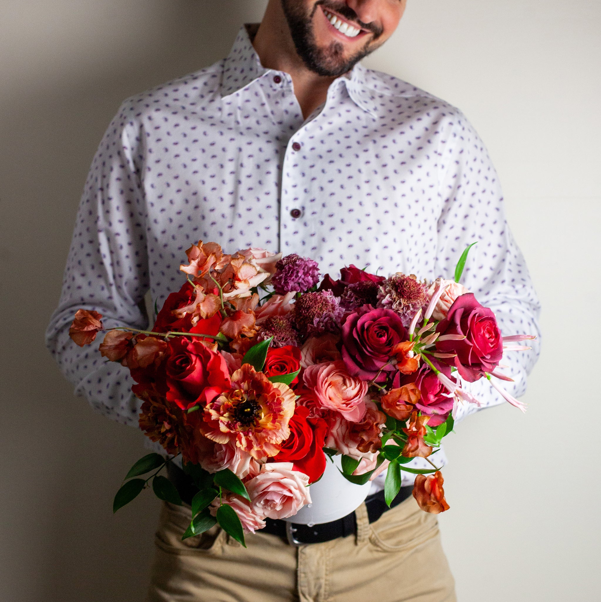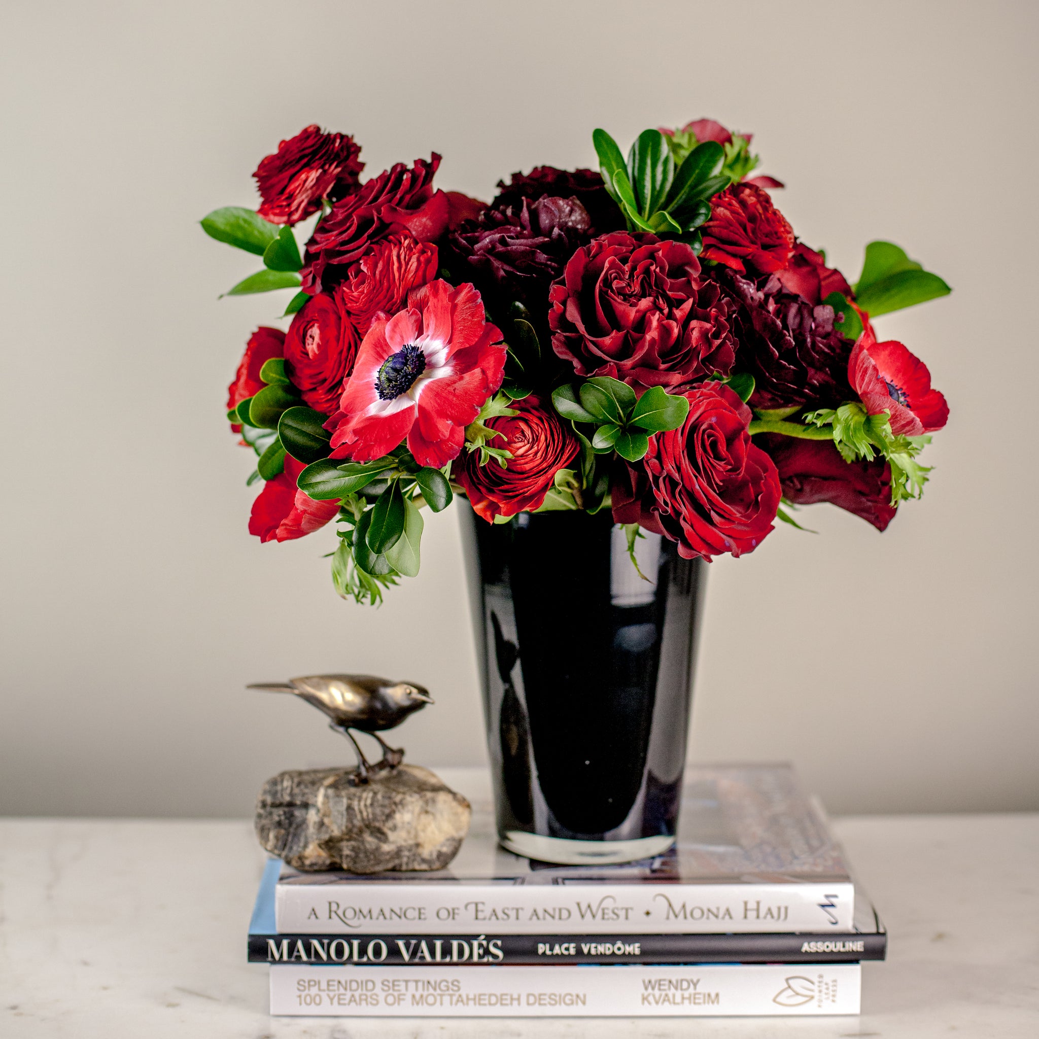 Experience the exquisite RED collection, featuring a spectrum of shades from crimson to burgundy. Our expert designers will meticulously select seasonal blossoms to craft a lavish arrangement.