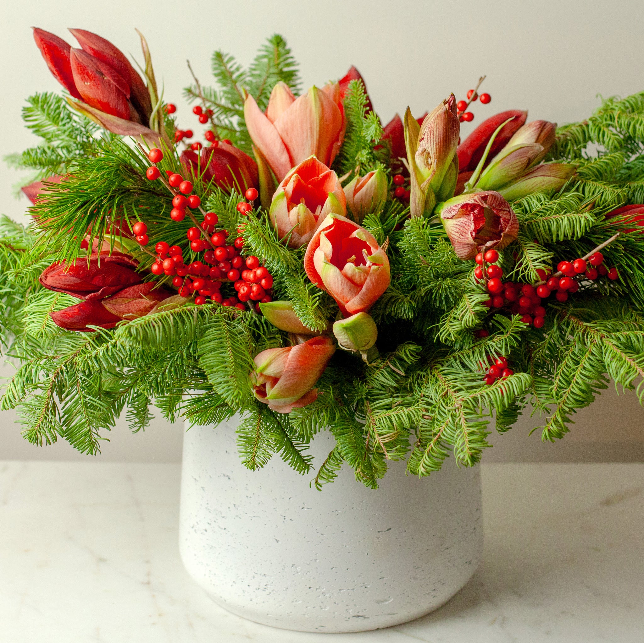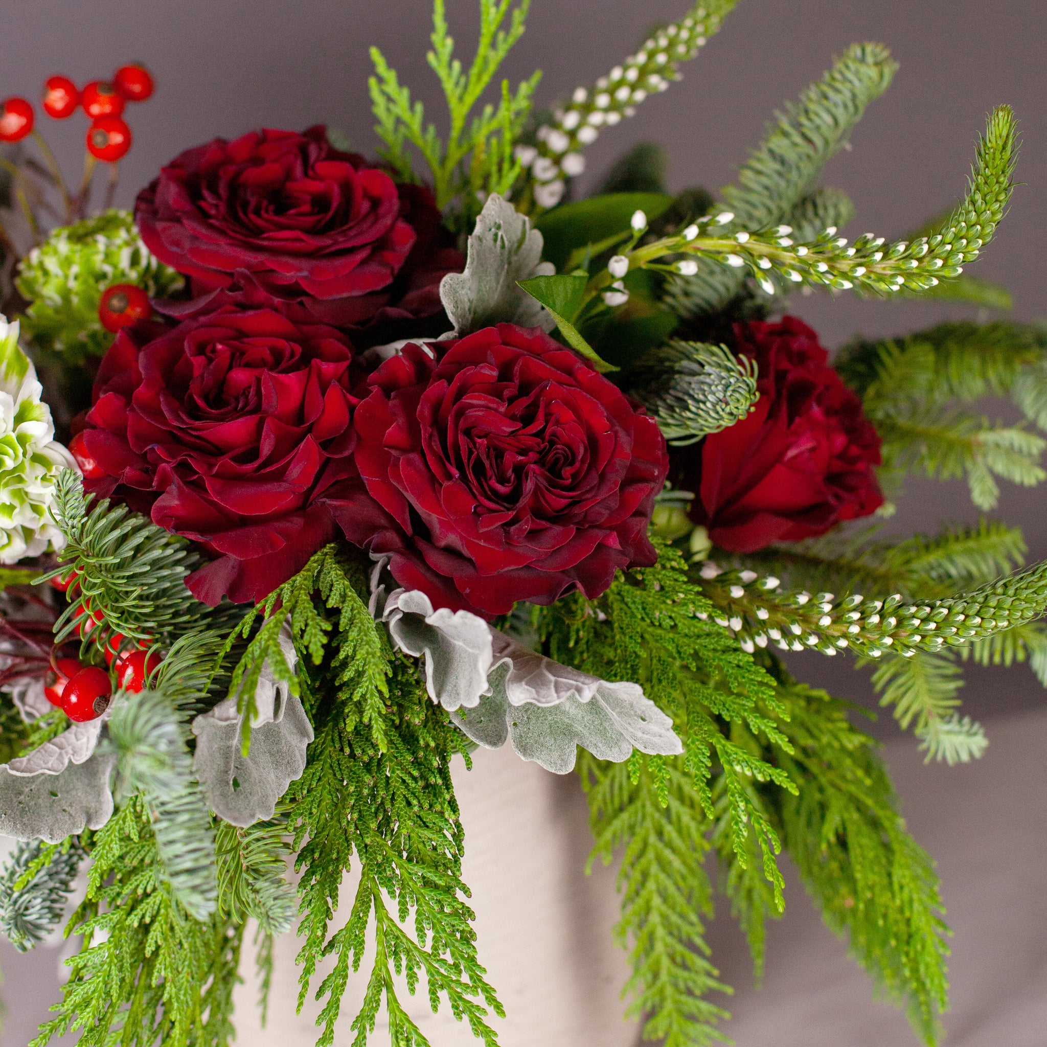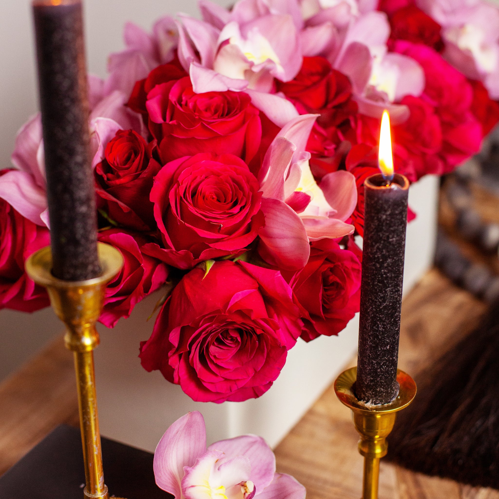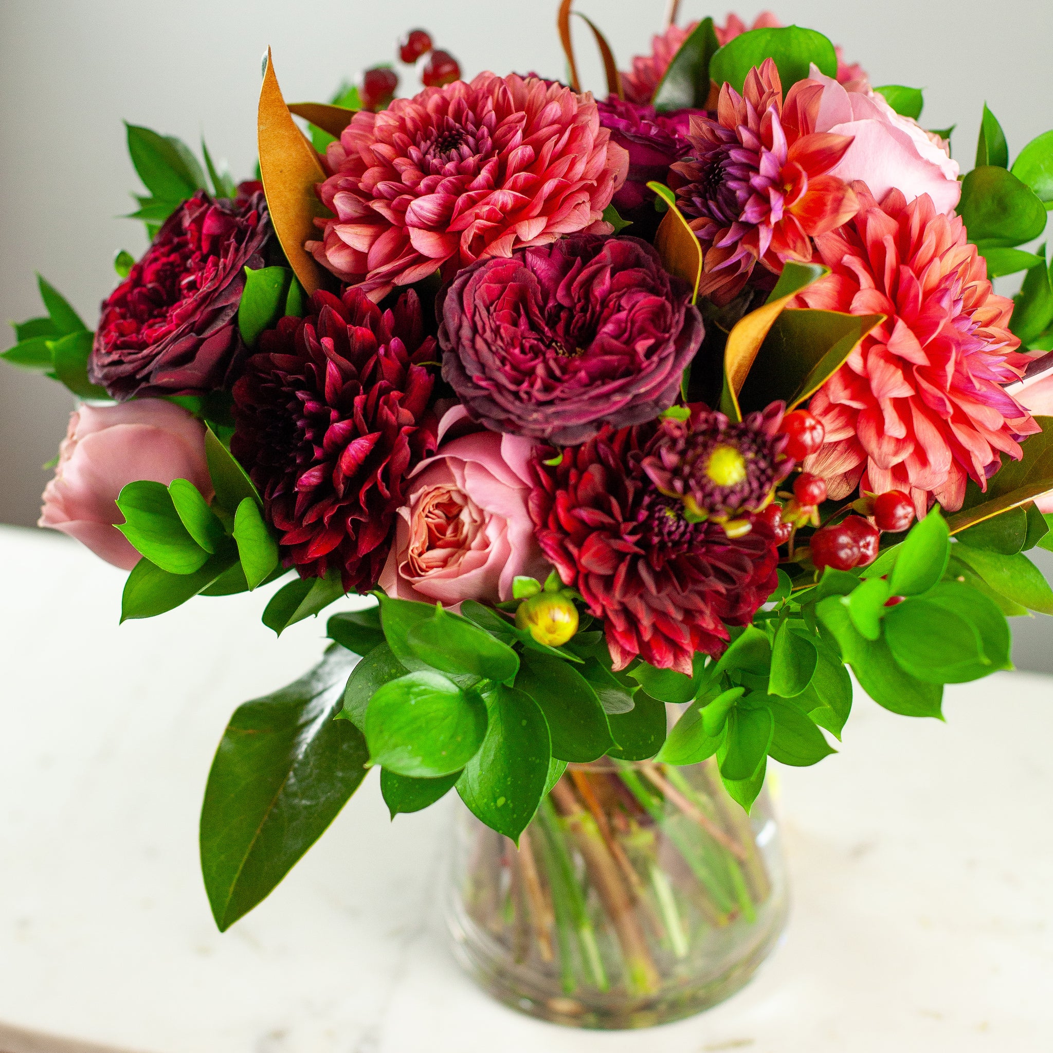 Experience the exquisite RED collection, featuring a spectrum of shades from crimson to burgundy. Our expert designers will meticulously select seasonal blossoms to craft a lavish arrangement.