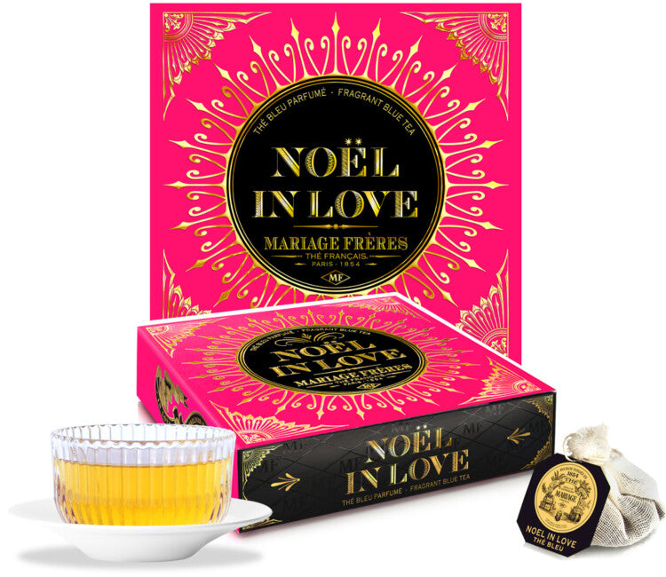 Mariage Frères NOËL IN LOVE® is a velvety blue tea inspired by Provençal Christmas traditions. Blending hazelnut, citrus, and candied fruits with nougat and calisson notes, this gourmet blend delivers a sweet, indulgent cup. Includes 30 premium French cotton muslin sachets in an elegantly designed gift box.