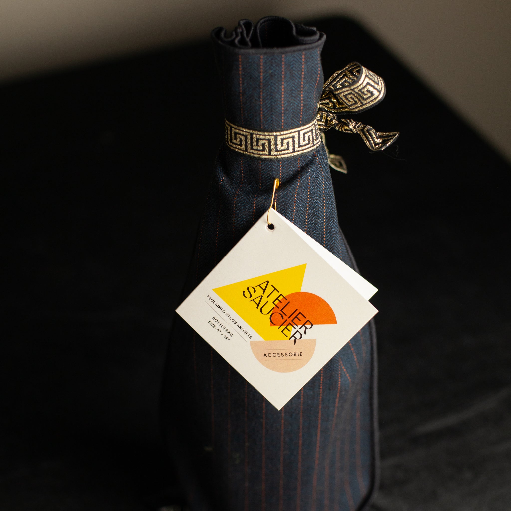 The Grecian Bottle Bag offers an elegant, reusable solution for wine and spirits gifting. Crafted from 100% reclaimed premium fabric with subtle stripes and Grecian-inspired trim, this 14" x 6" pouch eliminates single-use wrapping while adding a refined touch. Made in the USA.