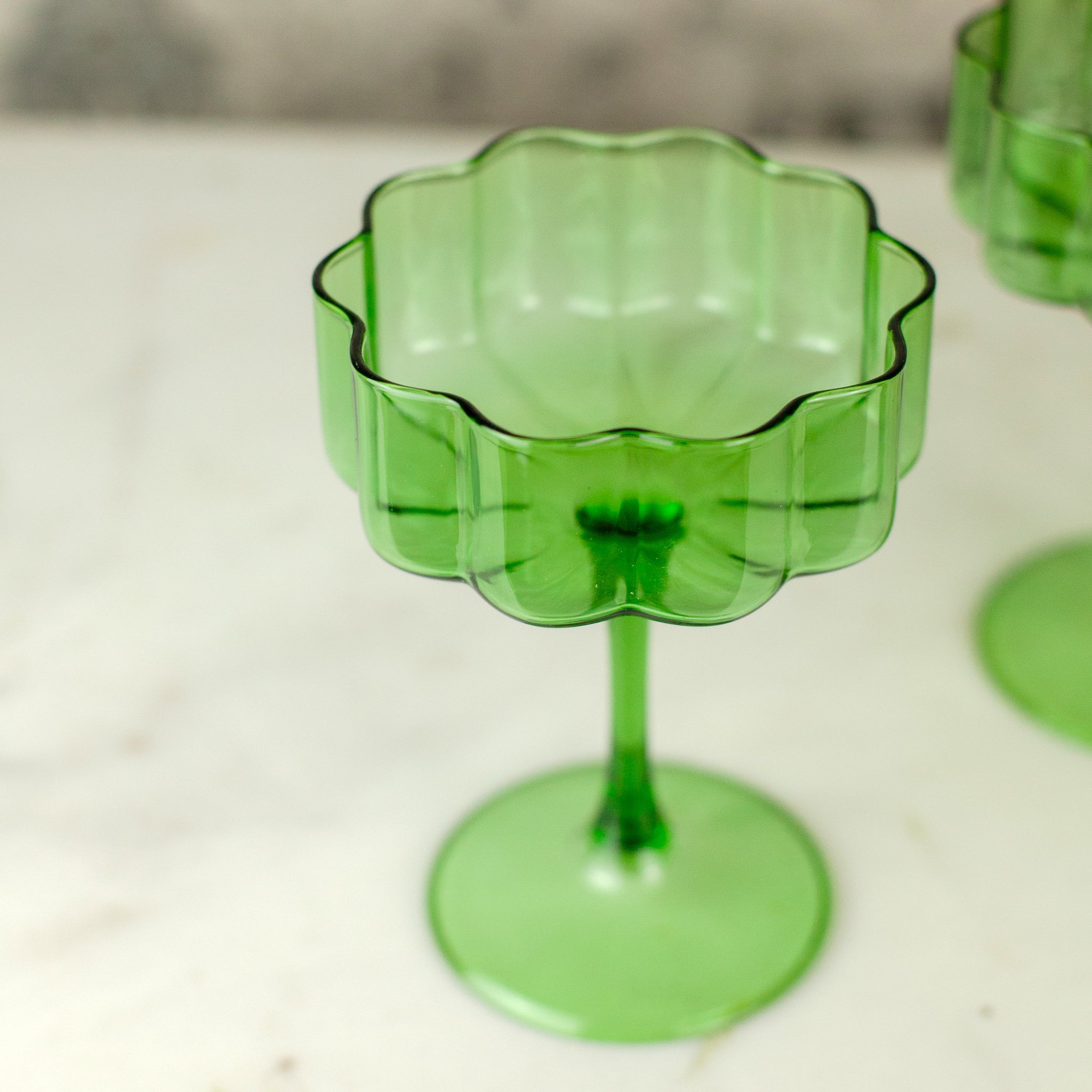 Fazeek Wave Green Coupe Glasses offer a modern twist on classic coupe glassware with their elegant stems and signature rippled edges. Hand-blown from high-quality borosilicate glass, each glass is unique and holds about 250ml. Perfect for sparkling drinks, cocktails, or desserts, these glasses come in a set of two. Dishwasher safe, but handwashing is recommended to preserve their delicate design. Handle with care to maintain their beauty and durability.