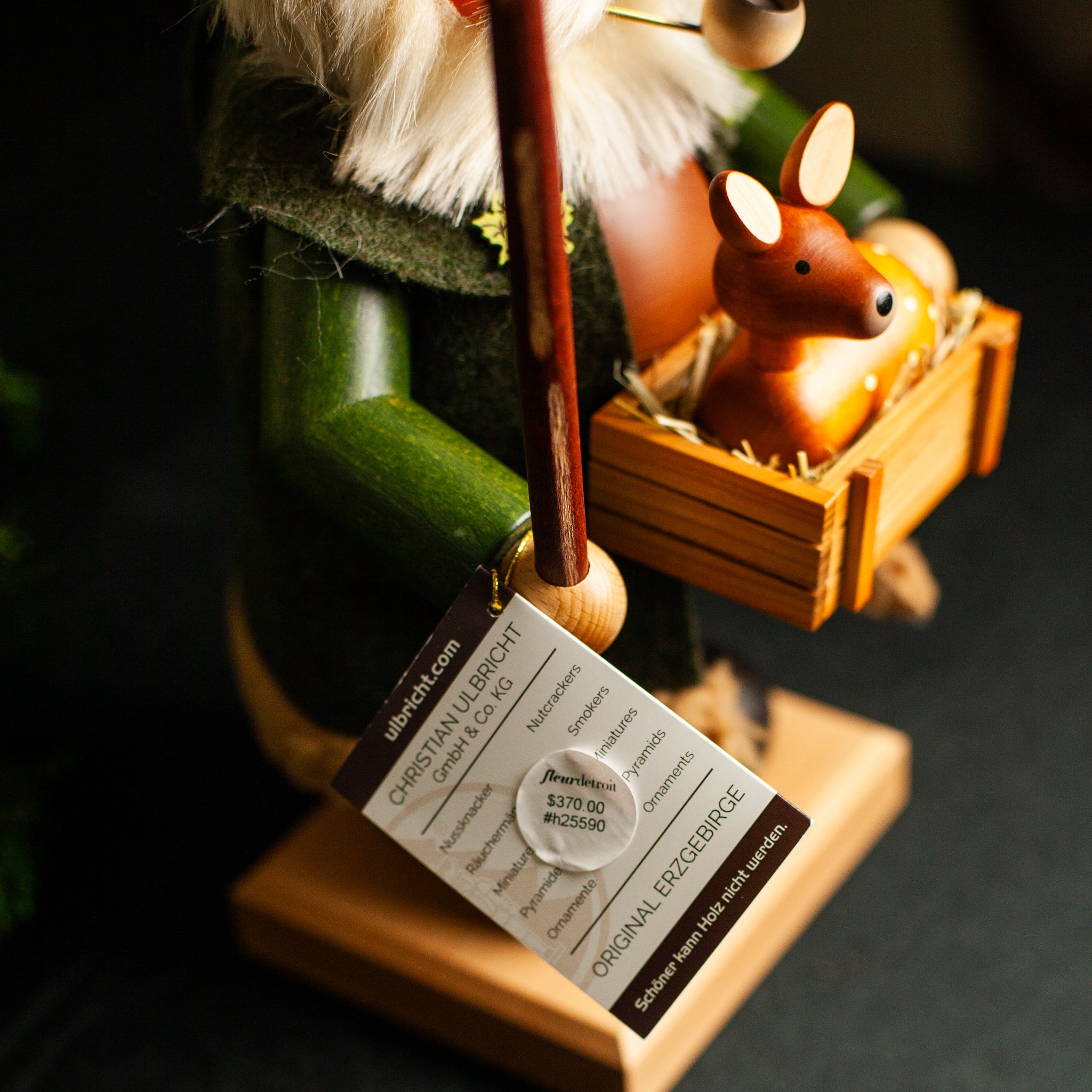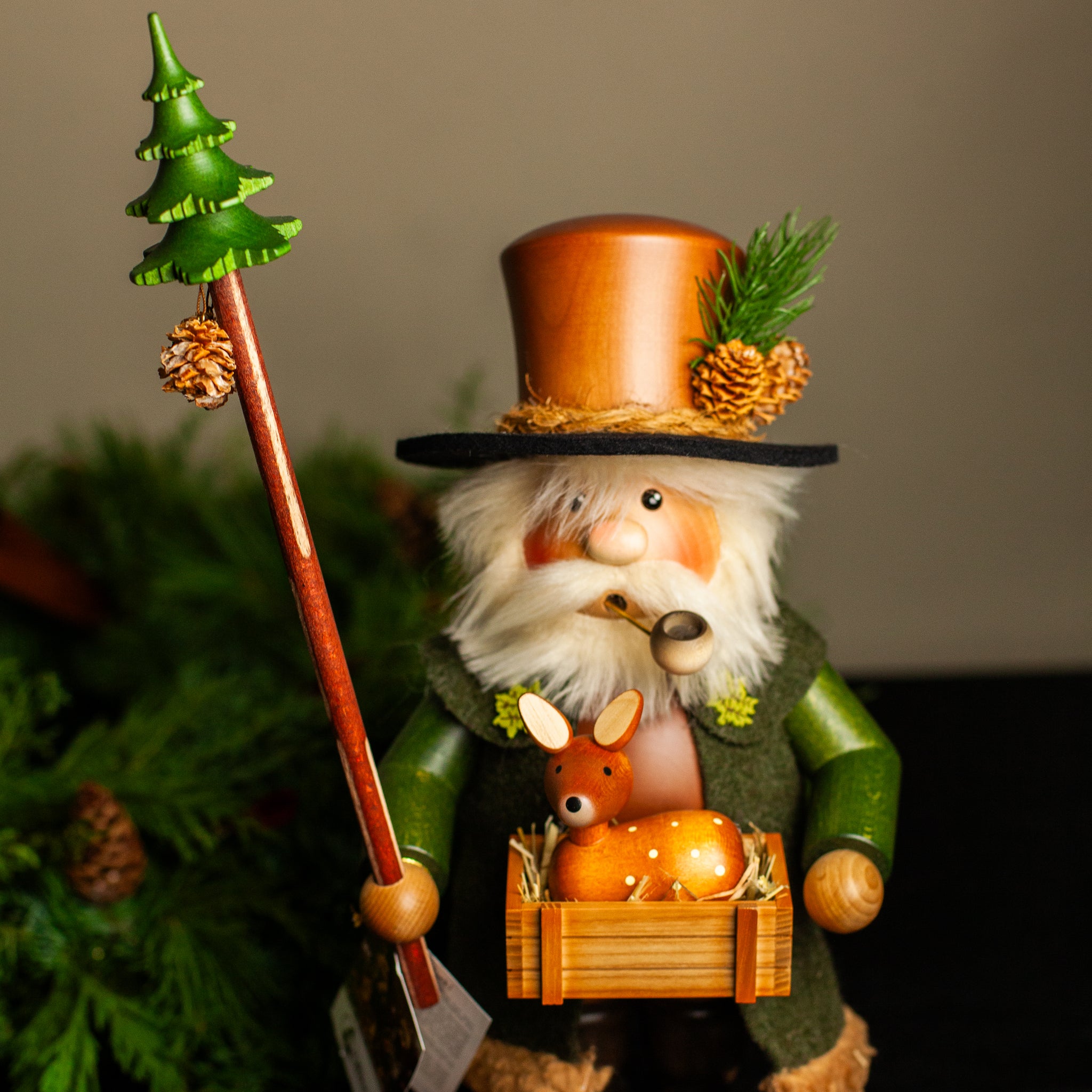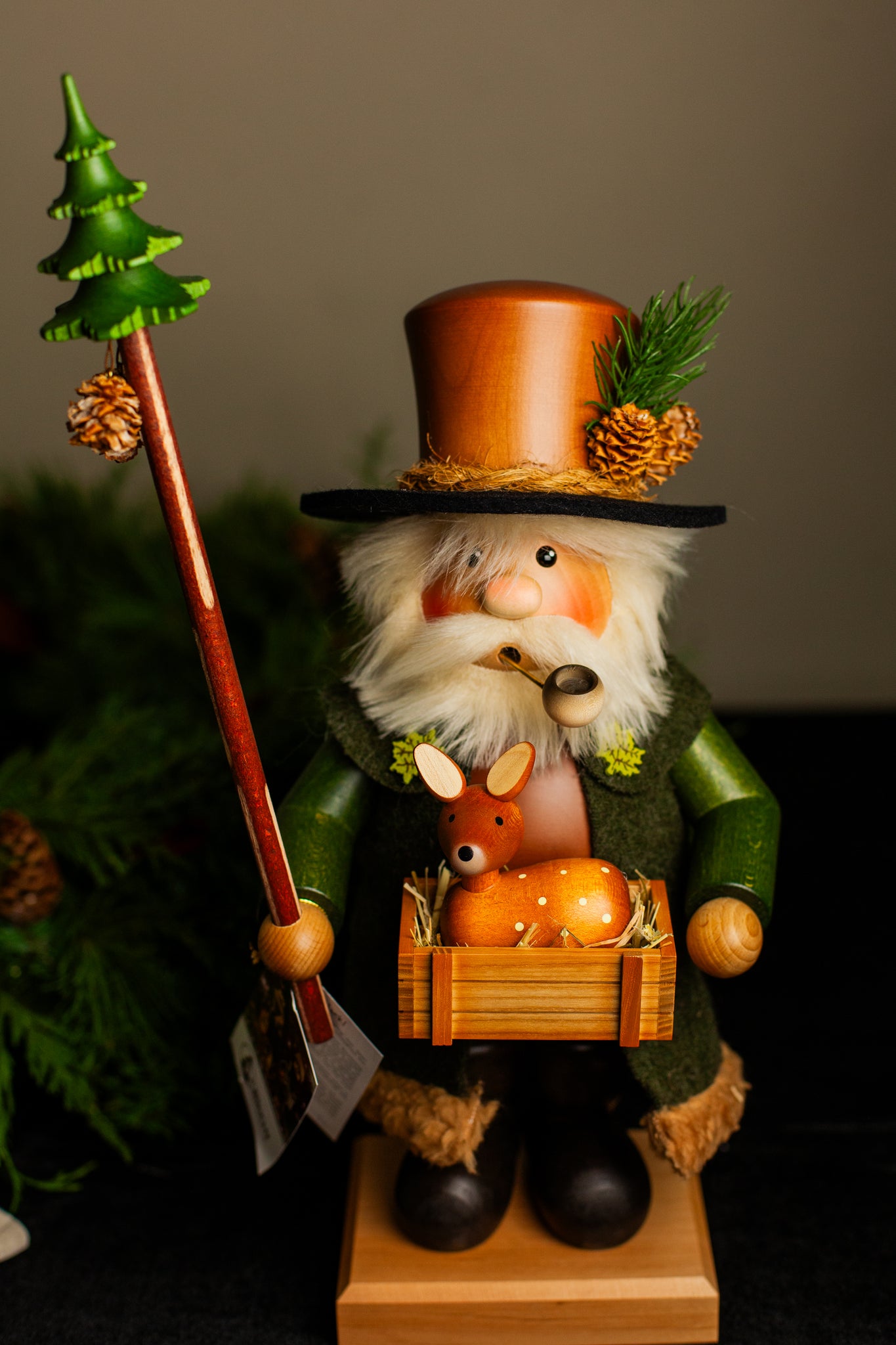 A handcrafted German smoker by Christian Ulbricht featuring a woodsman with deer in natural wood finish. Measuring 14.5"H x 8.25"W x 7.5"D, this piece exemplifies nine decades of meticulous artisanal tradition and attention to detail.