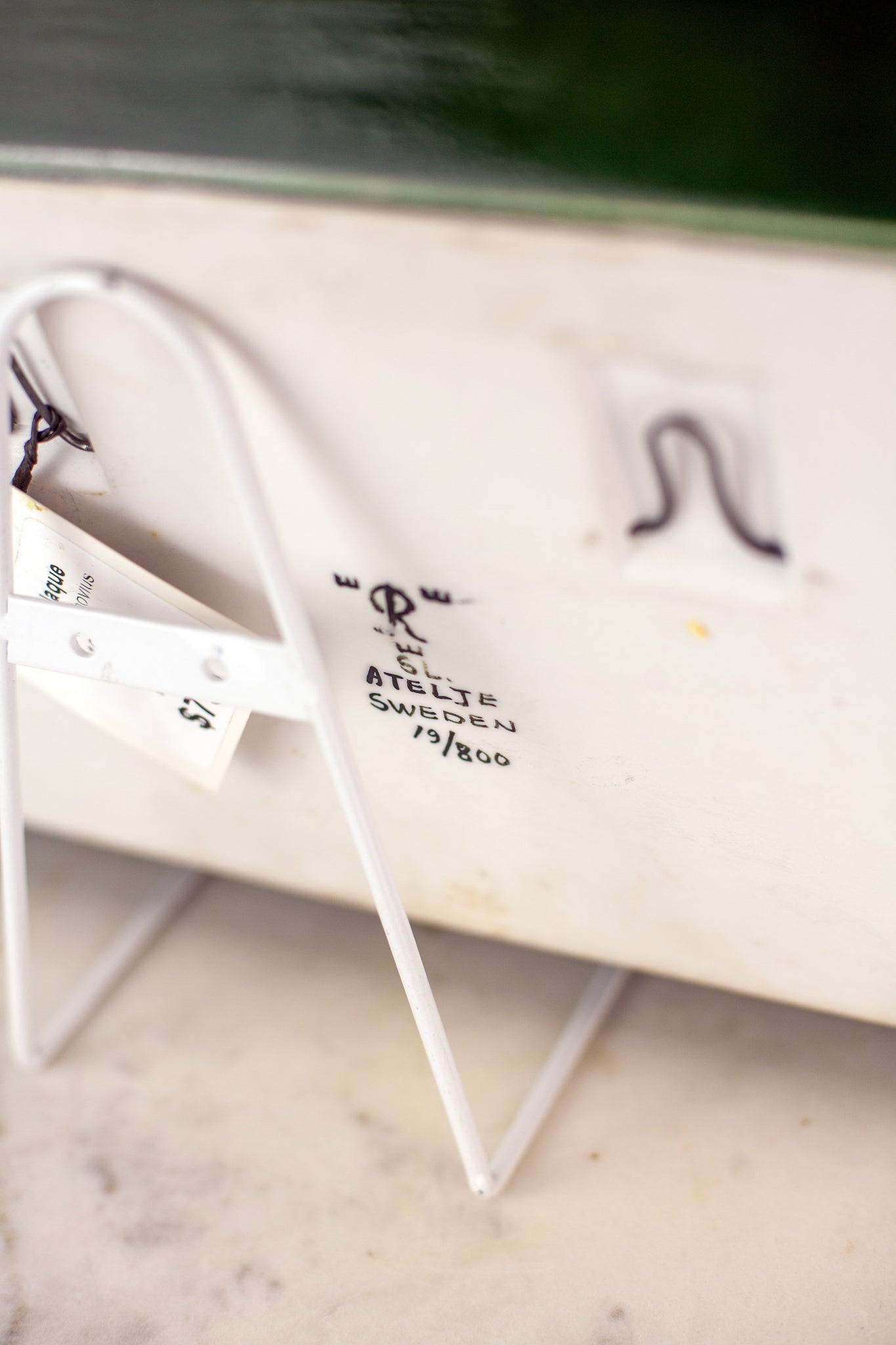 Vintage 1970s wall plaque by Sylvia Leuchovius featuring green glaze with white birds motif. Made at Rörstrand studio in Sweden. Rectangular stoneware in excellent condition. Measures 42cm wide, 26cm high, 3cm deep.