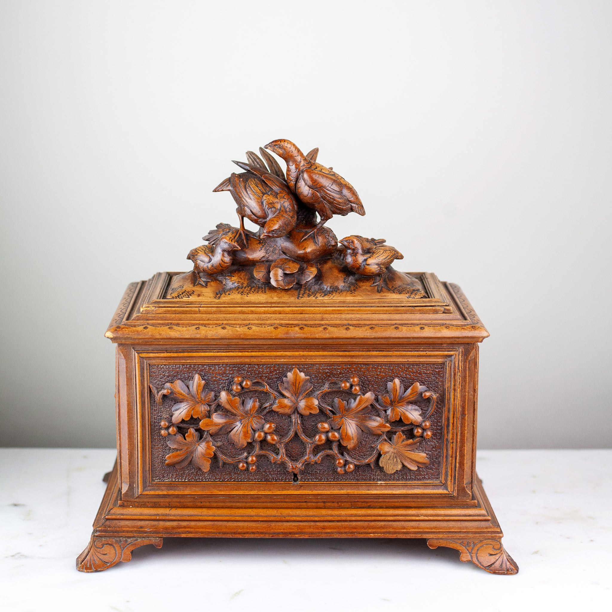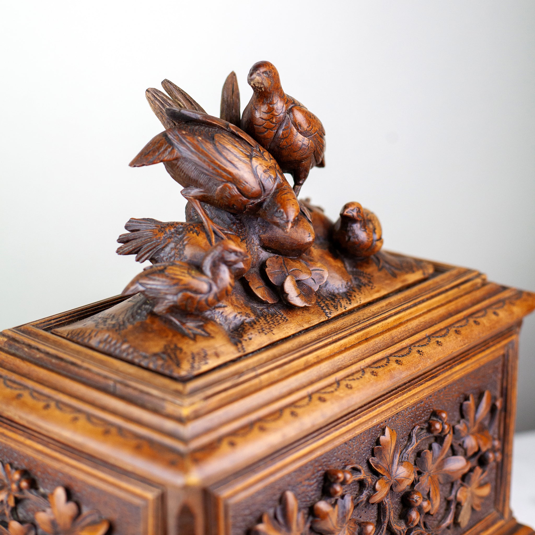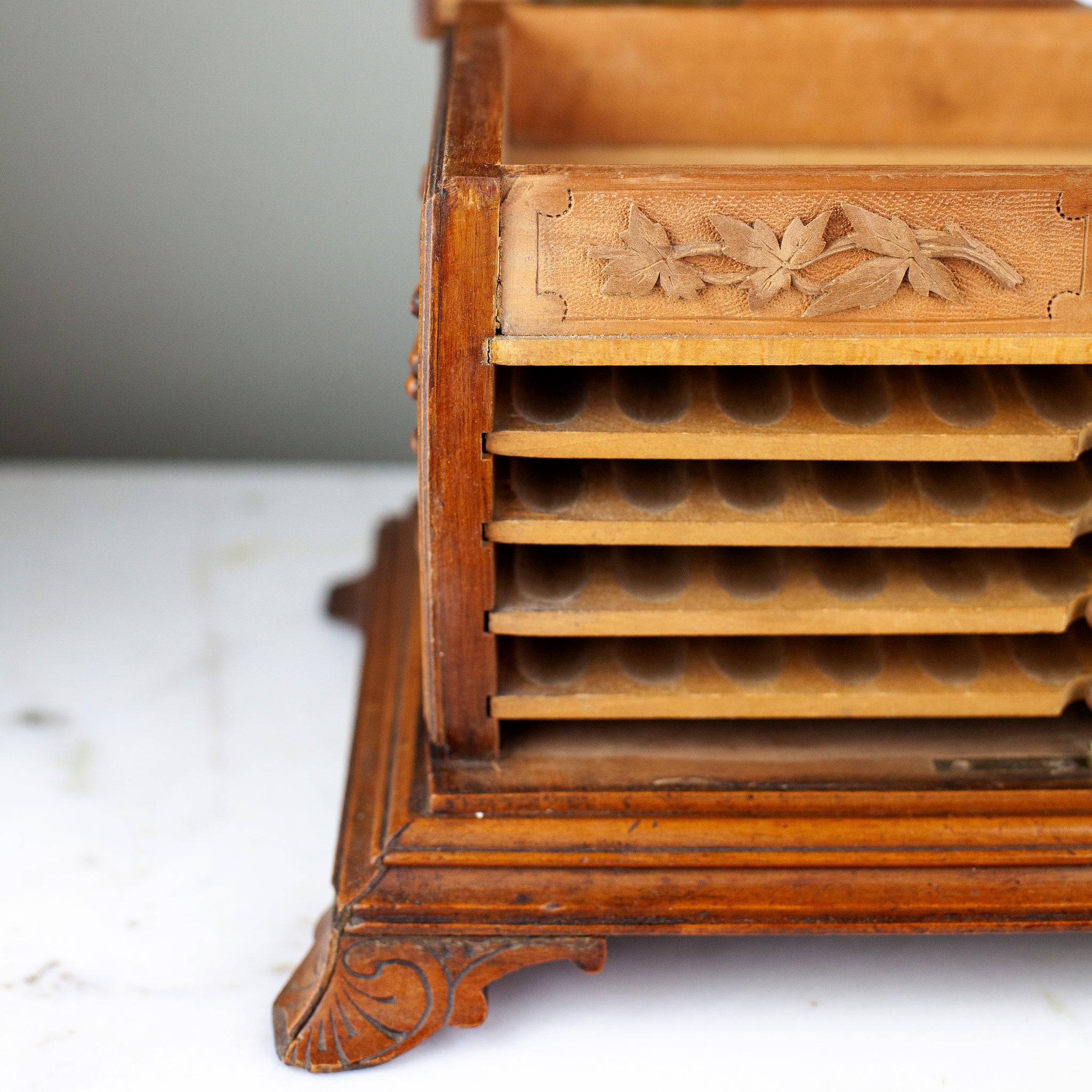 Embodying timeless luxury, 18 hand-carved cigar box is adorned with intricate decorative carving on the front. The interior, entirely original, boasts four trays that elegantly slide out, providing effortless access to cigars. With dimensions of 12.5" long x 13" tall, this large Black Forest box is truly a work of art, perfect for the refined connoisseur.